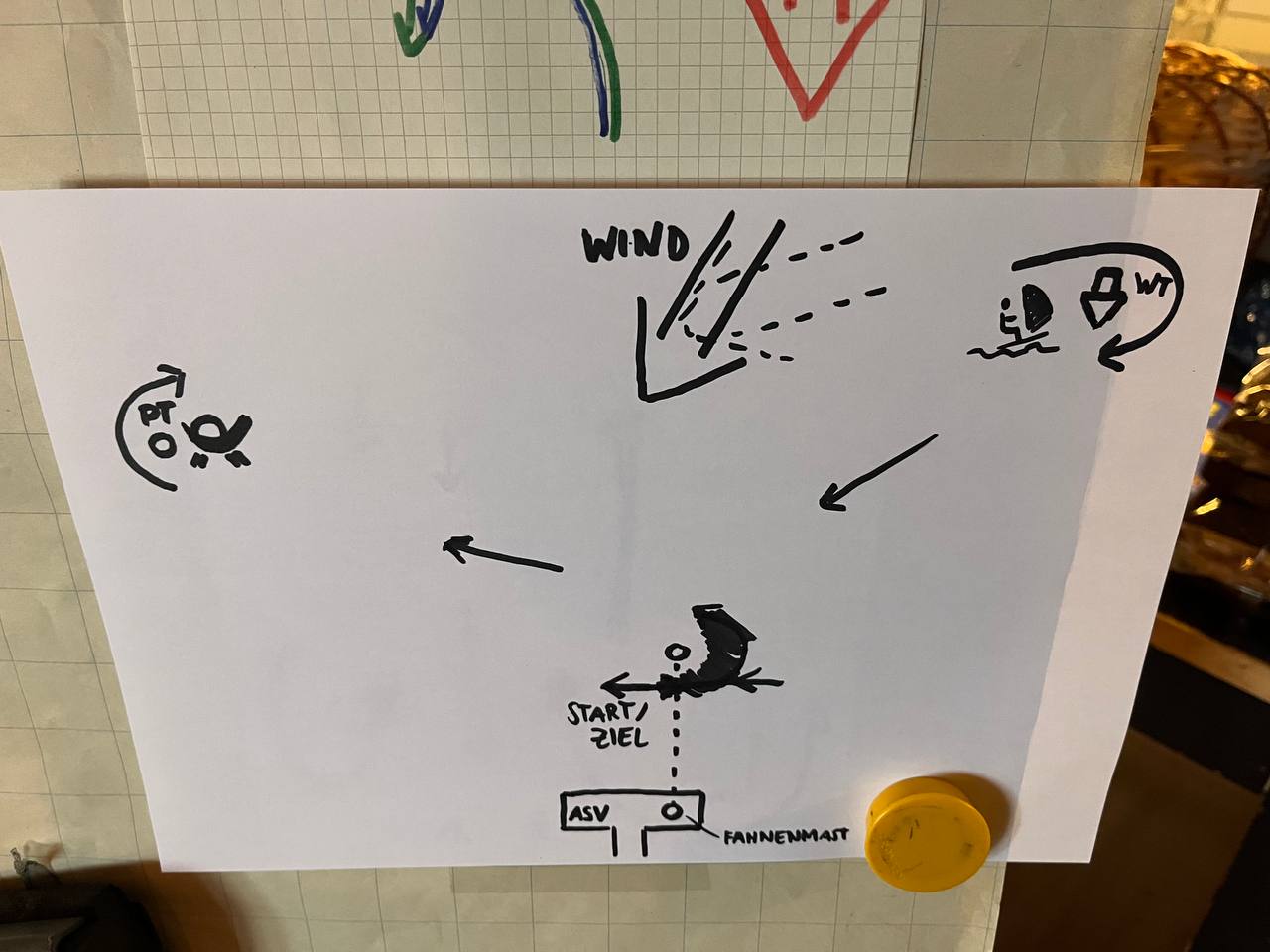 Am Samstag kam dann reichlich Wind und Regen – doch das hielt uns nicht ab. Es sah besser aus als erwartet und die Regattaleitung entschied den Zeitplan einzuhalten. Besprechung um 10 Uhr. Schließlich waren auch einige Mitglieder extra zur Regatta angereist (Jörn aus Oldenburg oder Felix Hartmann aus dem Norden Hamburgs (ja, Zitat Felix: er hat neben seiner Frau Lea auch ein H dazu gewonnen bei Eheschließung 😉 ). Es wurde ein neuer Kurs ausprobiert – unter Zuhilfenahme der Posttonne und der süd-östlichen Markierungstonne des Surfergebiets musste nur eine Regattatonne ausgebracht werden und die Regattaleitung konnte am Steg bleiben. Ein Kat brachte die Tonne in einer Linie mit dem Fahnenmast am Stegkopf aus und Manana (vom TMB bei den Winden sowieso gesperrt 😉 ) konnte trocken am Steg liegen bleiben. Fazit: weniger Vorbereitungsaufwand für Regattaleitung, allerdings stellenweise ein zu flacher Kurs, insbesondere für unsere Gleitjolle Dr. SchiVAGO. Also vielleicht im Frühjahr bei höherem Wasserstand nochmal probieren?